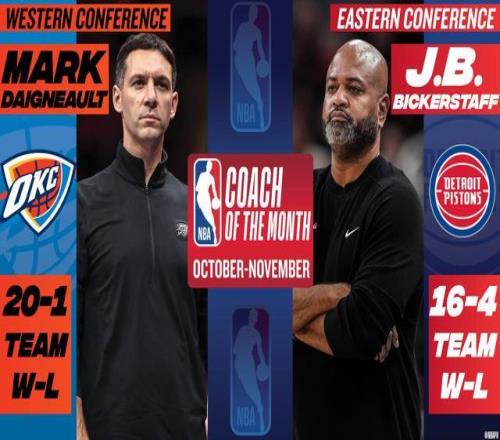 北京時(shí)間12月3日,NBA官方公布新賽季第一期月最佳教練,雷霆主帥馬克-戴格諾特和活塞主帥JB-比克斯塔夫分別當(dāng)選。