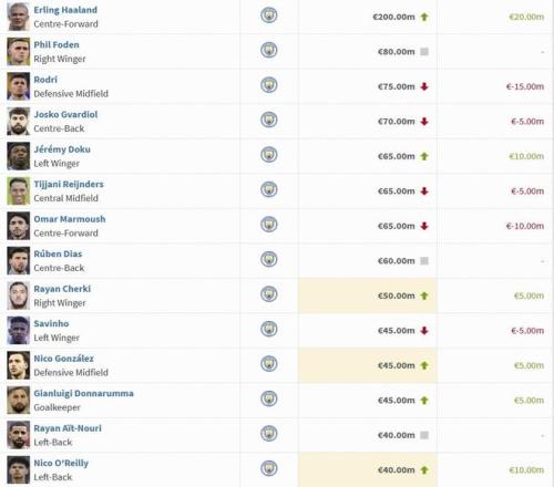 (注:榜單中未列及的球員維持原身價,本期身價沒有更新)